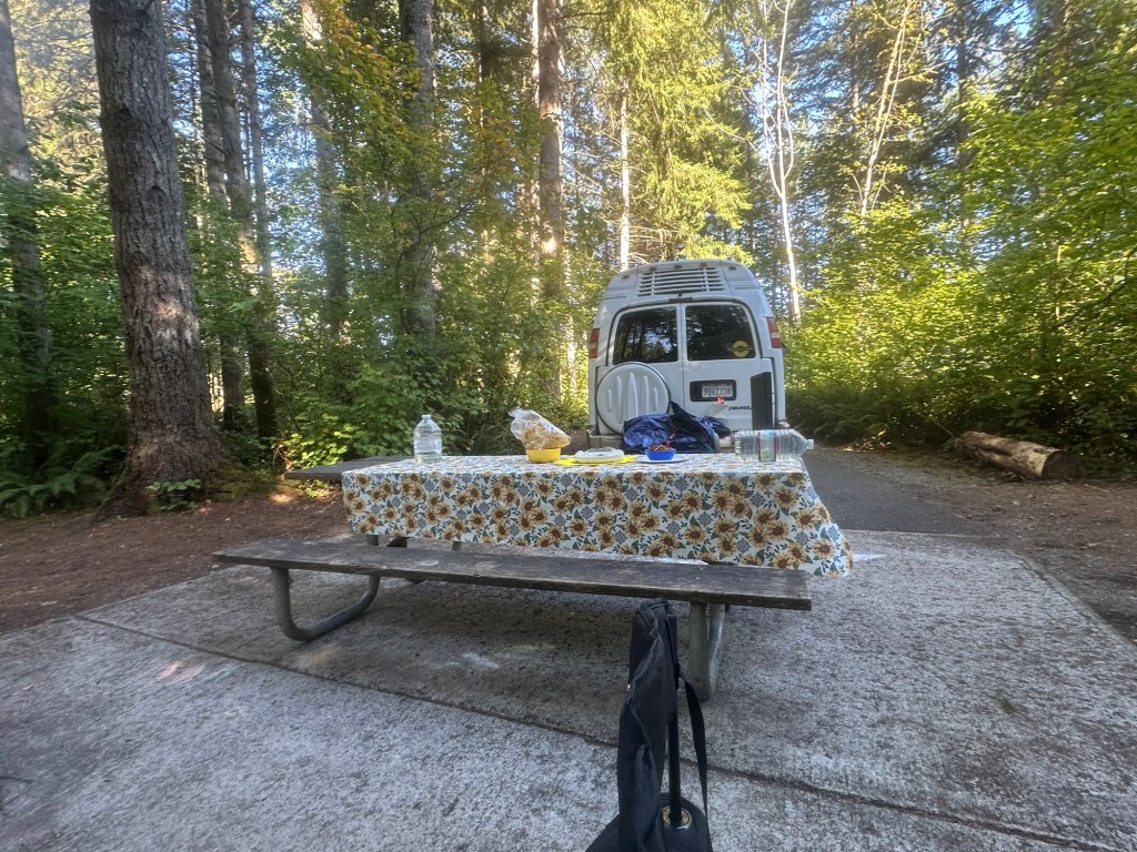 I drove around the park, scoping out the best parts for later the park is shaded with trees and shrubs and nicely paid parking spots with picnic tables and water nearby. I had a spot without electricity this time because I thought I’d be fine with my propane working (Ha Ha). I just wasn’t expecting it to not be up to snuff.